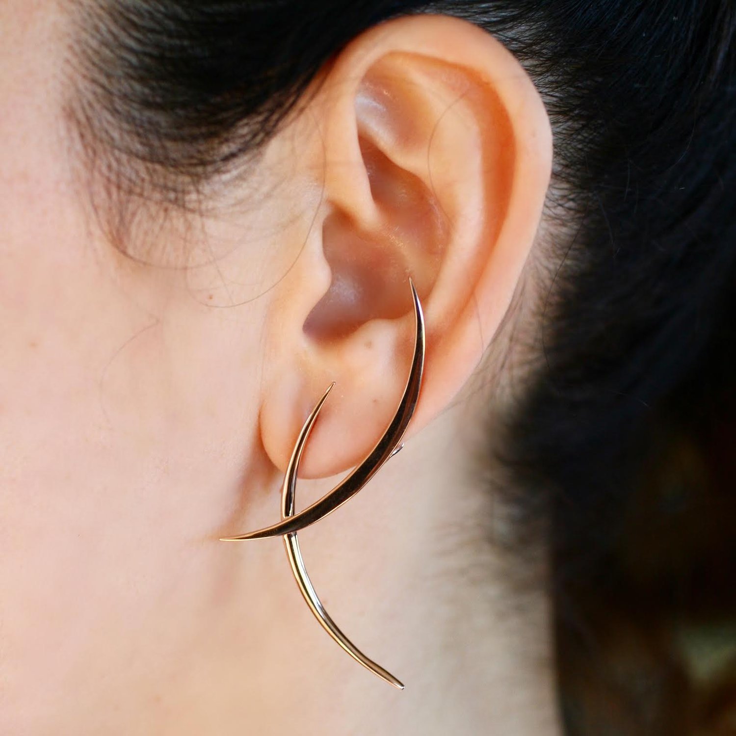 This solid 14k, rose gold double eclipse earring is a real stunner and will invoke your innermost lunar goddess. It is a single earring and is made to fit on your left ear. It has one post for a piercing and one hook that holds the top part in place. Available to ship immediately.